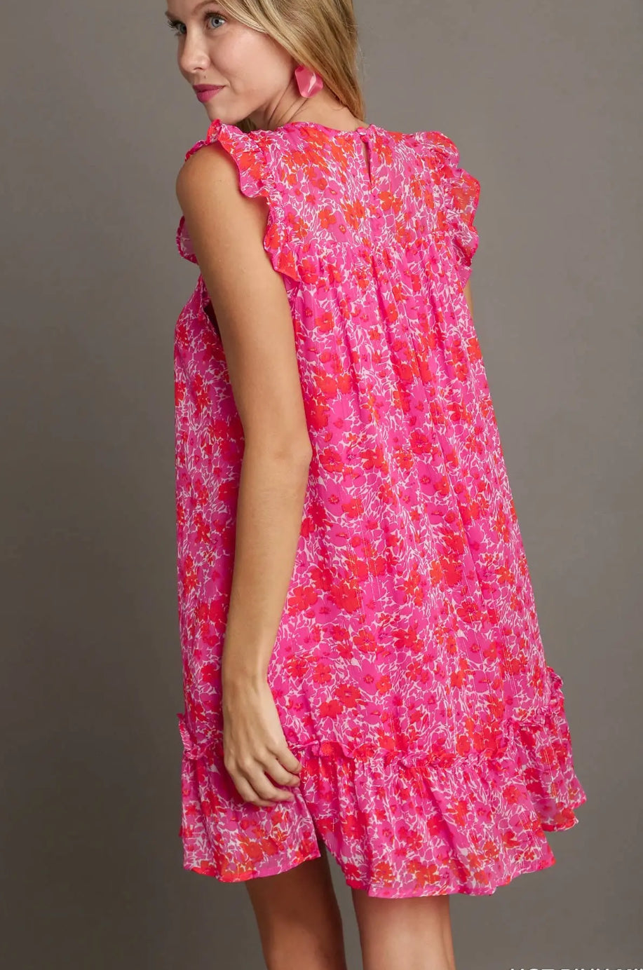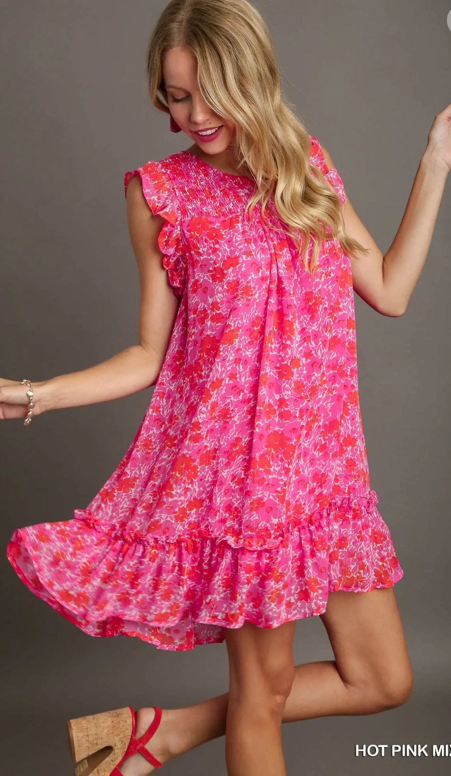 Sparkle Splash is a floral metallic dress with flutter sleeves and smocked detailing that flatters your figure. The lined design ensures comfort while metallic accents make a statement. Perfect for any occasion!